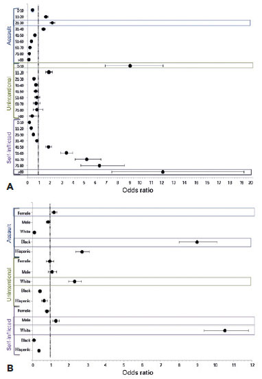 RESULTS: Of the 235,254 patients, 8,715 (3.7%) admitted with firearm-associated trauma had ocular injuries. Mean (standard deviation) age was 33.8 (16.9) years. Most were males (85.7%), White (46.6%), and from the South (42.9%). Black patients comprised 35% of cases. Common injuries were orbital fractures (38.6%) and open globe injuries (34.7%). Frequent locations of injury were at home (43.8%) and on the street (21.4%). Black patients had the highest risk of experiencing assault (odds ratio [OR]: 9.0; 95% confidence interval [CI]: 8.02-10.11; p<0.001) and street location of injury (OR: 3.05; 95% CI: 2.74-3.39; p<0.001), while White patients had the highest risk of self-inflicted injury (OR: 10.53; 95% CI: 9.39-11.81; p<0.001) and home location of injury (OR: 3.64; 95% CI: 3.33-3.98; p<0.001). There was a steadily increasing risk of self-inflicted injuries with age peaking in those >80 years (OR: 12.01; 95% CI: 7.49-19.23; p<0.001). Mean (standard deviation) Glasgow Coma Scale and injury severity scores were 10 (5.5) and 18.6 (13.0), respectively. Most injuries (53.1%) were classified as severe or very severe injury, 64.6% had traumatic brain injury, and mortality occurred in 16% of cases.
