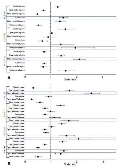TBI (64.6%) was most likely to occur following self-inflicted FAOI (OR: 5.37; 95% CI: 4.74-6.08; p<0.001). Figures 3A and 3B illustrate the relative associations of ocular injuries with GCS (TBI) and ISS. Severe FAOI associated with low GCS (<8) (OR: 22.91; 95% CI: 18.85-27.84; p<0.001) and high ISS (>24) (OR: 14.88; 95% CI: 12.73-17.38; p<0.001) were associated with the highest risk of mortality. When analyzed based on intention, unintentional firearm injuries were linked to minor TBI (OR: 2.40; 95% CI: 2.03-2.83; p<0.001) and ISS (OR: 3.73; 95% CI: 3.21-4.33; p<0.001), while self-inflicted injuries were associated with severe TBI (OR: 5.34; 95% CI: 4.82-5.93; p<0.001) and very severe ISS (OR: 2.99; 95% CI: 2.71-3.29; p<0.001). Consequently, self-inflicted injuries were linked to the highest risk of mortality (OR: 3.60; CI: 3.20-4.04; p<0.001). Assault injuries were most associated with a risk of mild or intermediate injury severity compared with the other intentions; GCS: 13-15 (OR:3.16, 95% CI: 2.88-3.46; p<0.001) and ISS: 9-15 (OR: 1.70, 95% CI: 1.52-1.90; p<0.001).