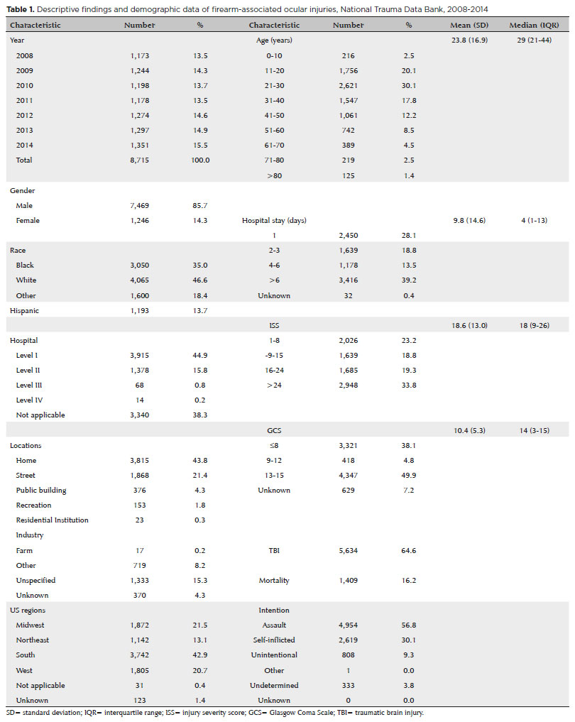 MÉTODOS: Foram identificados pacientes hospitalizados com lesões oculares associadas a armas de fogo no período de 2008 a 2014, a partir do Banco de Dados Nacional de Trauma (National Trauma Data Bank), usando os códigos de diagnósticos da CID9MC e códigos “E” para causas externas. A análise estatística foi efetuada usando o programa SPSS. O nível de significância considerado foi de p<0,05.