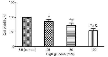 As shown by the CCK-8 assay, incubation with high glucose (25, 50, or 100 mM) resulted in a remarkable decline in cell viability in a dose-dependent manner compared with the control (p<0.05) (Figure 2).