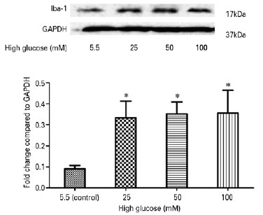 Treatment with high glucose (25, 50, or 100 mM) upregulated the protein expression of Iba-1, which is a specific marker for activated microglia, compared with the control (p<0.05) (Figure 3). Western blotting analysis did not reveal significant differences among the groups treated with different concentrations of high glucose (p>0.05).