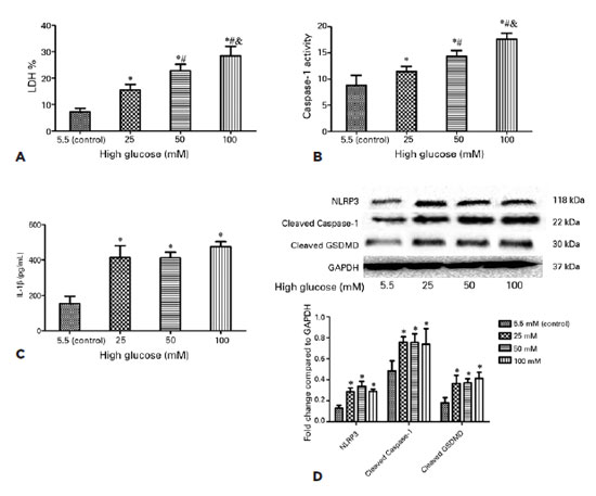 LDH release and caspase-1 activity in the high glucose-treated group (25, 50, or 100 mM) were higher than those measured in the control group (p<0.05) (Figure 4A, B), showing a dose-dependent effect.