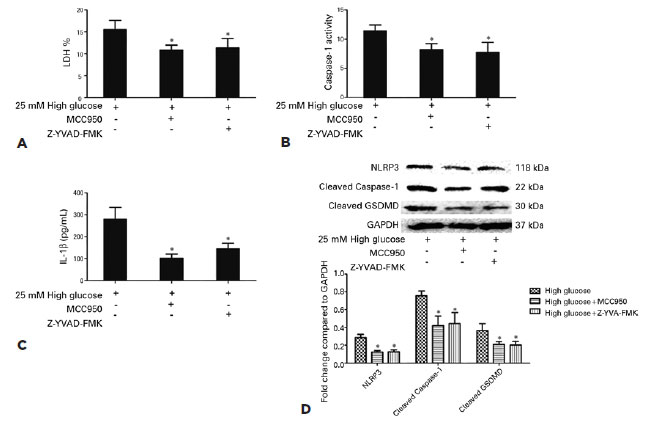 Métodos: A micróglia da retina foi estimulada por altos níveis de glicose durante 24 horas. A viabilidade celular, a liberação de LDH e a atividade da caspase1 foram analisadas in vitro. Avaliou-se a expressão de citocina pró-inflamatória (IL1β), de marcador de micróglia ativado (Iba1), de NLRP3, de caspase1 clivada e de GSDMD clivada. Subsequentemente, a micróglia da retina foi pré-tratada com inibidores da sinalização de inflamassomas NLRP3 antes da estimulação com altos níveis de glicose e suas alterações moleculares e funcionais foram avaliadas.