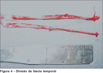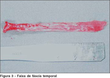Após tricotomia da região temporal (Figura 1) e anestesia local com lidocaína associada a vasoconstritor, faz-se uma incisão arqueada, como parte da incisão coronal, supra-auricular medindo cerca de 5 cm, situada 4 cm atrás da implantação capilar(14). A seguir, procede-se a dissecção subcutânea a fim de expor a fáscia temporal profunda com sua coloração branco-brilhante (Figura 2). A quantidade de fáscia a ser colhida vai depender da lateralidade da cirurgia, se uni ou bilateral. Com bisturi lâmina 15 faz-se uma faixa de 6 cm de comprimento por 6 mm de largura (Figura 3), se a cirurgia é bilateral são confeccionadas duas faixas(18).