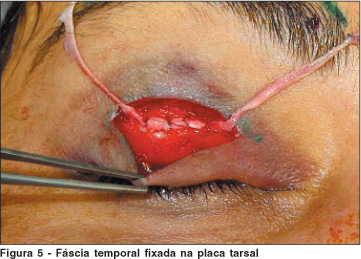 A incisão cutânea é seguida da abertura do músculo orbicular até o plano da placa tarsal. Não é necessário a dissecção em direção ao rebordo orbitário superior. A faixa de fáscia temporal é fixada à face anterior do tarso(19) (Figura 5), em seu terço superior por 3 pontos, o central deve ser feito no nível da pupila, e os outros dois no nível do limbo medial e lateral(18). São realizadas duas incisões de 4 mm logo acima da última fileira do supercílio, uma lateral divergindo cerca de 10 mm em relação ao limbo lateral e uma medial que deverá divergir 10 mm do limbo medial; é necessária que estas duas incisões sejam aprofundadas até alcançar o periósteo, uma terceira incisão frontal deverá localizar-se 10 mm acima das anteriores numa posição central (coincidindo com a pupila) sendo esta mais superficial que as outras com o objetivo de preservar o músculo frontal(18).