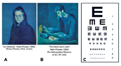 We can illustrate the difference between a blind eye and a blind person by referring to two portraits painted by Pablo Picasso in 1903. “Celestina” has an opaque (left) cornea but a normal right eye. In “The Blind Man’s Meal,” the character is using his hands to identify the food, and the face lacks the globe of the eye. These paintings illustrate the distinction between a blind person (“The Blind Man’s Meal”) according to the WHO definition and a person with a blind eye (Figure 1).