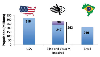 From recent estimates, the number of blind individuals in the world is approximately 36 million, and the number of those with moderate to severe visual deficiencies is 217 million(8). Taken together, this is a population comparable in size to those of the largest countries such as Brazil (211 million people) and the USA (327 million people)(8-10) (Figure 2).