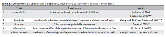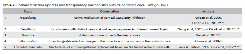 In summary, the five recent observations about the corneal structure and the response to injuries are examples of relevant information brought to the Plato’s cave of corneal blindness that, once overcoming the initial wave of skepticism and being applied to treatments for corneal blindness, will change the epidemiological scenario described above (Table 2). Interestingly, a review article authored by Tseng and Tsubota in 1997 advanced some of these concepts, although without the steps or molecular details(58).