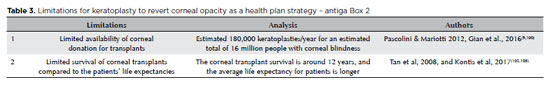 1) The limited availability of corneas for all cases of corneal blindness. An average of 180,000 corneal transplants is performed every year worldwide, far less compared with the 16 million patients with corneal opacities and low vision or blindness(9,11,99,100). In fact, the estimated number of donor corneas or penetrating keratoplasties available every year covers only 1 out of every 70 cases awaiting this treatment(99). A considerable effort to increase the number of donor tissues and the number of facilities to treat those people would be necessary to revert corneal blindness with this strategy. Considering these numbers, the capacity must grow several times over to be able to meet the present demand.