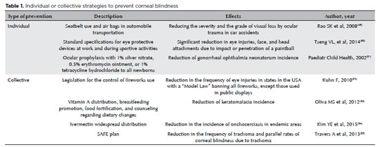 These observations indicate that preventive measures can be used to reduce the occurrence of ocular trauma and infectious keratitis, two major causes of corneal blindness(26,28) (Table 1). However, the frequency of these illnesses and the same patient profiles can be found throughout the world. Therefore, the myth of Plato’s cave applies to corneal blindness, revealing the shadows on the wall to be topics on the size of the problem and its “accidental” causes. Two of the previous assumptions can be refuted by data: corneal blindness is not rare, and despite knowledge on its epidemiology, the incidence remains high.