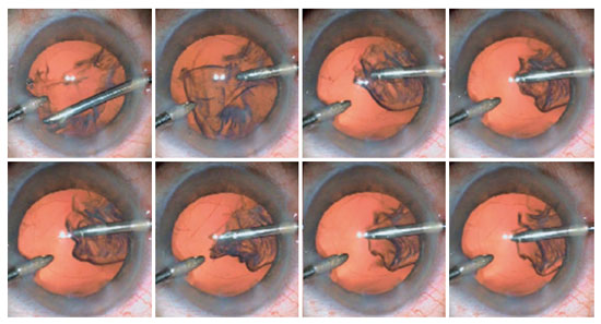 We planned cataract extraction for both eyes of the patient with left priority. Intravenous mannitol 20% (1 g/kg) was administered one hour before surgery. We used topical anesthesia and eyelid akinesia with modified van Lint techniques. We observed unusual undulation and flaccidity of the lens capsule in response to irrigation fluid currents during the irrigation or aspiration of the cortex (Figure 1).