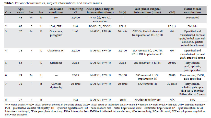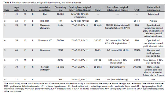 Early results regarding the acutephase management and clinical outcomes were previously reported(2). Table 1 summarizes the early and late results. In total, the infection was eradicated in seven eyes, whereas one eye underwent evisceration after corneal involvement and uncontrolled infection (Case 1).