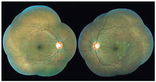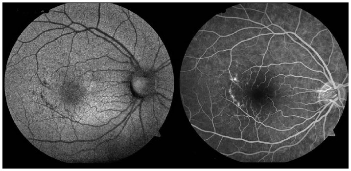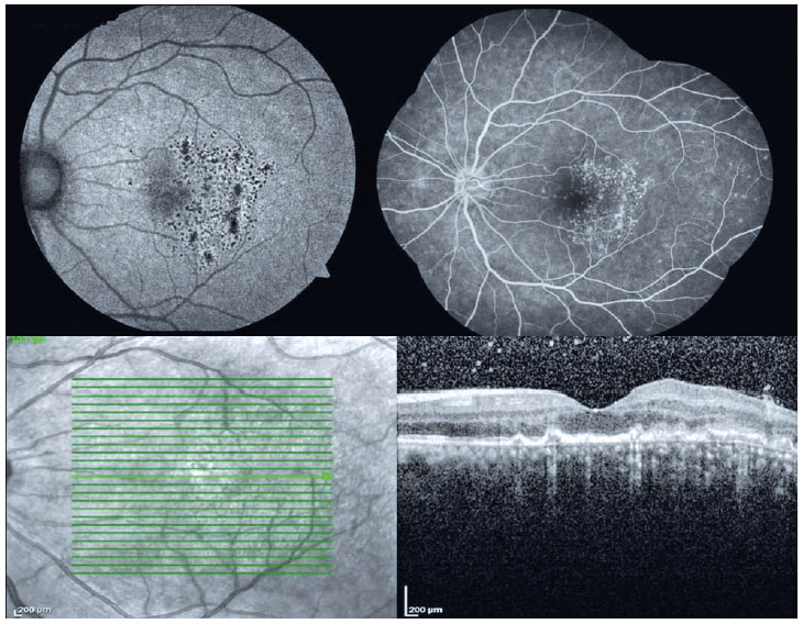 A 32-year-old Caucasian female presented with diminished visual acuity in the left eye (LE) for 3 weeks associated with metamorphopsia and nasal scotoma. Her past medical history included myasthenia gravis (MG), which was being treated for the past 12 years with 150 mg azathioprine, 5 mg prednisone, and 120 mg pyridostigmine. Her family history was unremarkable, and epidemiological evaluation for infectious diseases showed negative findings. Her best corrected visual acuity (BCVA) was 20/20 J1 (-0.50/-0.25 × 180º) and 20/100 J5 (-0.25/-0.25 × 170º). Intraocular pressure was 12 mmHg in both eyes, and there were no changes in the anterior segment, except for discrete left ptosis. Fundus examination revealed clear vitreous, isolated, punctate, yellowish perimacular lesions in her right eye and multiple yellow-white lesions that were confluent in the macula and punctate in the periphery in her LE (Figure 1). Laboratory findings, including the venereal disease research laboratory (VDRL) test, the fluorescent treponemal antibody absorption test (FTA-ABS), and hepatitis serology, were negative. Tuberculin skin test reading was 5 mm, although the immunoglobulin release assay (IGRA) showed negative result for Mycobacterium tuberculosis. FAF demonstrated hypoautofluorescence with hyperfluorescent margins (Figures 2, 3) corresponding to the lesions observed in both eyes, and FA revealed hyperfluorescence since early phases without late leakage (Figures 2, 3). SD-OCT disclosed areas of intermittent RPE elevations, disruption of the ellipsoid zone, and sub-RPE hyporeflectance (Figure 3). The patient was diagnosed with PIC and then treated with an increased prednisone dose of 1 mg/kg/day. After 2 weeks of treatment, her BCVA and imaging status were improved, and within 30 days, she achieved complete visual recovery, with pigmentary alterations remaining on the fundus examination (Figure 4).