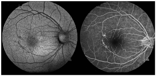 The white dot syndromes (WDS) are a group of inflammatory disorders that affect the outer retinal layers, the retinal pigment epithelium (RPE), and the choroid and include birdshot chorioretinopathy, multiple evanescent white dot syndrome, acute posterior multifocal placoid pigment epitheliopathy (APMPPE), multifocal choroiditis with panuveitis (MCP), serpiginous choroiditis, punctate inner choroidopathy/multifocal choroiditis (PIC/MFC), and relentless placoid chorioretinitis(1). Punctate inner choroidopathy (PIC) is an inflammatory syndrome that primarily affects myopic women in their second or third decade of life. It is characterized by multifocal, small, yellow-white spots at the level of deep retina and choroid in the posterior pole that evolve into atrophic chorioretinal scars without signs of anterior uveitis or vitritis(2). Despite the progress made in differentiating each of the WDS, an overlap can occur and a definite diagnosis is not always possible. Recently, a classification system based on multimodal imaging was proposed by Raven and colleagues to differentiate the WDS through the findings on fundus autofluorescence (FAF), fluorescein angiography (FA), indocyanine green angiography (ICG), and spectral-domain optical coherence tomography (SD-OCT)(3). Herein, we report a case of an unusual presentation of PIC in a young female with a previous diagnosis of myasthenia gravis and concomitant use of azathioprine, prednisone, and pyridostigmine. Fundus aspect resembled a placoid disease; however, multimodal imaging demonstrated features typically found in PIC, configuring this as a diagnostic challenge.