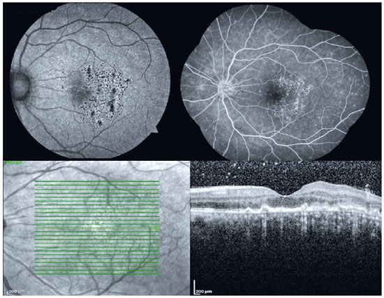 Management of PIC is challenging, with the treatments ranging from observation to intensive immunosuppression or intravitreal anti-VEGF therapy. Some patients have long periods of quiescence, with long-term remission, but some have sight-threatening episodes. Although there is a lack of evidence suggesting a beneficial role for corticosteroids, their use in the acute phase appears to abbreviate the course and lead to stabilization. Immunosuppressive therapy has been used in recurrent cases with sight-threatening lesions, although there is no consensus on which drug has the best profile. CNV lesions, when present, respond well to anti-VEGF therapy, putting aside photodynamic therapy as the first line of treatment, due to its high recurrence rates(2,4,9,10). In our case, the patient was already using the immunosuppresants azathioprine and prednisone. Therefore, after excluding an infectious cause, we established an increase in the corticosteroid intake of up to 1 mg/kg/day, which confirmed to be beneficial for the fast recovery of functional and anatomical aspects.