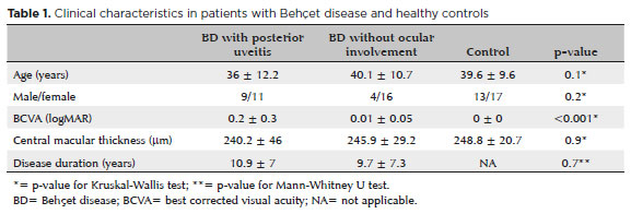 A total of 20 patients with Behçet uveitis, 20 patients with Behçet disease without ocular involvement, and 30 healthy controls were included in this study. The groups were similar with respect to age and sex. The clinical characteristics of the study groups are summarized in table 1.