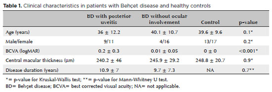 The statistical analyses were performed using SPSS version 17.0 (Chicago, IL, USA). The normality of the data was determined by Shapiro-Wilk test. The Kruskal-Wallis test was used to compare the OCT-A parameters among patients with Behçet disease with ocular involvement, patients with Behçet disease without ocular involvement, and control subjects. The categorical variables were analyzed using Pearson’s X2 test, and Pearson correlation analysis was used for correlative analyses. Quantitative variables were presented as mean ± standard deviation. A p-value <0.05 was considered statistically significant, except in subgroup analyses requiring Bonferroni correction, in which appropriate adjustments were made.