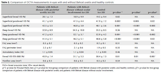 MÉTODOS: Foram incluídos 40 pacientes com doença de Behçet e 30 controles saudáveis. A densidade vascular retiniana nos plexos capilares superficial e profundo, a zona avascular foveal, o índice de circularidade, a densidade foveal e a área sem fluxo da retina superficial foram medidos automaticamente, através do software AngioVue para angiografia por tomografia de coerência óptica, e comparados entre os grupos.