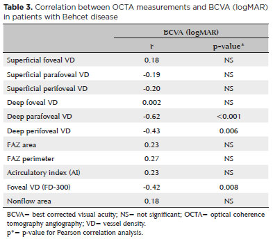 In patients with Behçet disease, there was a significant correlation between BCVA and DCP parafoveal and perifoveal VDs (Table 3). A similar correlation between global and regional deep capillary VDs and BCVA was also reported in a previous study(10). As a quantitative measure of the degree of macular ischemia, such a correlation between VD and visual acuity is understandable. Future longitudinal studies are required to ensure that these parameters can be used as predictors of visual outcome in Behçet uveitis.