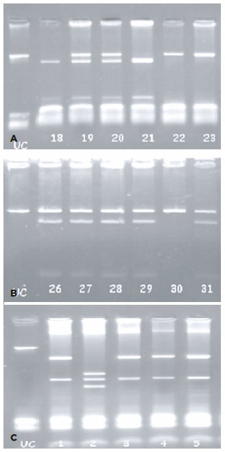 After collecting whole venous blood from both control and pterygium groups in EDTA-containing tubes, DNA was isolated using the phenol-chloroform method. Haplotypes of the BsmI (rs1544410), FokI (rs 2228570), and TaqI (rs 731236) polymorphisms were analyzed using polymerase chain reaction and restriction fragment length polymorphisms, as previously described (Table 1)(15). Briefly, the VDR polymorphisms of BsmI, FokI, and TaqI were screened with BsmI, FokI, and TaqI restriction enzymes, according to the procedure reported in Panierakis et al. with minor modifications (15). Restriction with endonucleases was visualized under UV after running in a 3% agarose gel electrophoresis (Orange G was used as the dye) in 100-volt potential for 30 min in an electrophoresis cast (Biogen, MA, USA) (Figure 1).