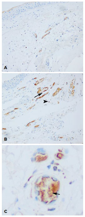 The age, sex, and serum vitamin D levels did not vary between the two groups (p>0.05) (Table 2). The results of the logistic regression analysis did not show a relationship between the polymorphisms of BsmI, FokI, or TaqI and age, gender, or serum vitamin D levels (p>0.05) (Table 3). The pathological evaluation showed increased vascular proliferation and inflammatory cell infiltration in the pterygium tissue compared with healthy adjacent tissues. VDR reactive immunostaining was detected in the subepithelial stromal tissue, in the endothelial cells of the subepithelial micro-vessels, and the intravascular cells (Figure 2). The VDR protein expression values for the pterygium and control tissues were 0.47 ± 0.58 versus 0.26 ± 0.47 (p=0.04) for the inflammatory cells of the subepithelial stromal tissue, 0.64 ± 0.54 versus 0.32 ± 0.56 (p=0.002) for the vascular endothelium, and 1.92 ± 1.0 versus 1.18 ± 0.99 (p=0.0001) for the intravascular inflammatory cells, respectively (Table 4).