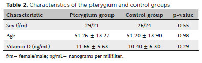 MÉTODOS: Foram incluídos pacientes com pterígio (n=50) e voluntários saudáveis (n=50). Os níveis séricos de vitamina D foram medidos em ambos os grupos. Foi feita uma coloração imuno-histoquímica para o receptor da vitamina D em cortes obtidos do pterígio e dos tecidos conjuntivais saudáveis adjacentes dos mesmos indivíduos. A existência de polimorfismos do receptor da vitamina D (BsmI, FokI e TaqI) no genoma foi analisada em DNA obtido do sangue venoso dos participantes, usando métodos de Polymerase chain reaction (PCR) e RFLP.