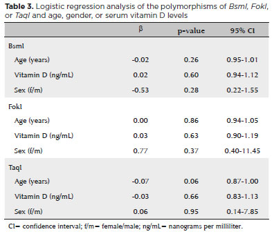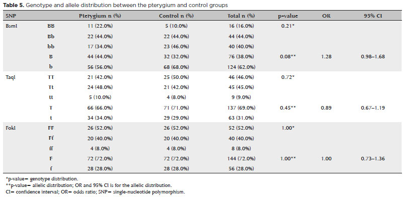 CONCLUSÕES: Os níveis séricos de vitamina D não apresentaram diferenças entre o grupo de pessoas saudáveis e o com pterígio. A expressão do receptor da vitamina D mostrou-se maior no grupo com pterígio do que no tecido saudável adjacente. Entretanto, a análise dos polimorfismos do receptor da vitamina D nos pacientes com pterígio não revelou qualquer diferença significativa nos polimorfismos BsmI, FokI ou TaqI em comparação com os voluntários saudáveis.