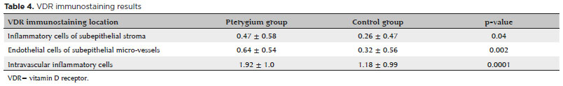 There is a marked increase in the angiogenesis and overexpression of vascular endothelial growth factor in pterygium tissue(17). Vitamin D plays a role in the inhibition of vascular endothelial growth factor-induced endothelial cell differentiation and proliferation(23). We detected a significant increase in VDR expression in the endothelial cells of the subepithelial micro-vessels. Since the anti-angiogenic effect of vitamin D is well-defined in the literature(23,24), we speculate that vitamin D may also have a regulatory effect on angiogenesis by increasing VDR expression in the endothelium. The number of inflammatory cells indicates the severity of the inflammation. Golu et al. found diffuse infiltration of T-lymphocytes, B-lymphocytes, and macrophages in the subepithelial connective tissue in patients with pterygium(25). Pterygium tissue has been reported to have increased levels of inflammatory markers, such as intercellular adhesion molecule-1, vascular cell adhesion molecule-1, and human leukocyte antigen(26). The findings reported in these studies support the role of cellular immunity in the formation of pterygium. However, the number of chronic inflammatory cells is independent of the level of UVR exposure, suggesting the possible presence of an intrinsic mechanism in the regulation of inflammation(27). We found increased VDR expression in the inflammatory cells of the subepithelial stromal tissue and intravascular inflammatory cells. These results are consistent with findings reported in the literature, and may provide evidence for the anti-inflammatory function of vitamin D in pterygium through the expression of VDR in inflammatory cells(22,25,27).