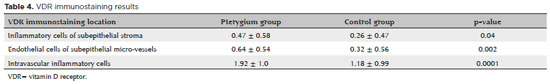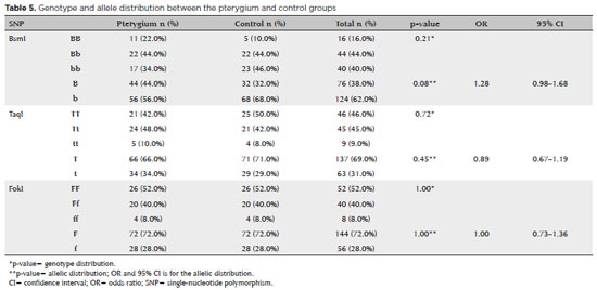 RESULTADOS: Não foi observada nenhuma diferença entre os níveis séricos de vitamina D dos pacientes com pterígio e os dos controles saudáveis. Entretanto, a expressão tissular do receptor da vitamina D foi maior nas células endoteliais dos microvasos do pterígio (p=0,002), nas células estromais sub-epiteliais (p=0,04) e nas células inflamatórias intravasculares (p=0,0001), quando comparada à expressão no tecido conjuntival saudável adjacente. Além disso, embora o haplótipo BBtt tenha sido duas vezes mais frequente, o haplótipo bbTt foi 2,5 vezes menos frequente e o haplótipo BbTT foi 2,25 vezes menos frequente no grupo de controle do que no grupo com pterígio (p<0,001).