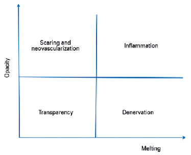 After identifying that treatment is not simple or widely accessible and that the cure is not possible in several cases due to the time restrictions of the treatments, it is necessary to identify the pathophysiological events associated with corneal opacity. Destruction of the cornea occurs in one of the following two ways: a) melting and perforation caused due to inflammation and necrosis and/or b) scarring and neovascularization caused due to denervation. Depending on the intensity of each process, it may cause corneal damage to one of the poles (ulceration or neovascularization) or restrict it somewhere between the two (Figure 3). Therefore, inflammation and denervation are the events that need to be reverted to prevent corneal blindness.
