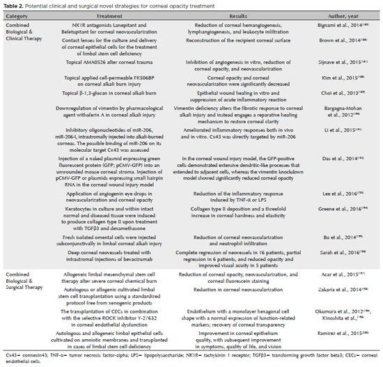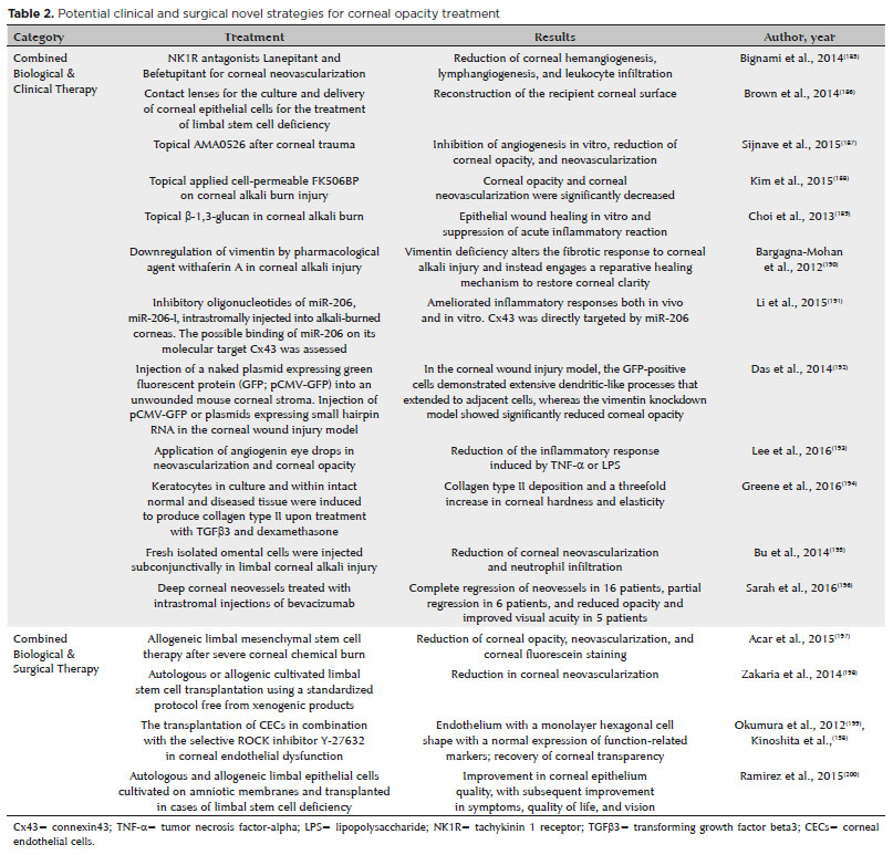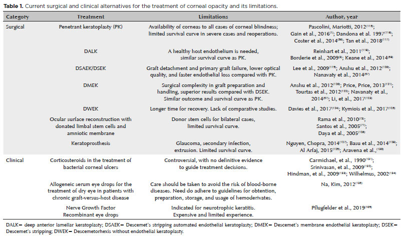 Corneal blindness is a health problem and a therapeutic challenge. If few conditions have found efficient strategies as trachoma, which is being treated with the combined strategy that includes Surgery, Antibiotics, Facial cleaning, and Environmental improvement (SAFE), and vitamin A supplementation can prevent keratomalacia secondary to nutritional problems even in remote regions, there are several conditions causing corneal blindness that are not being efficiently reverted by the currently available therapeutic strategies(201,202). Novel therapeutic strategies using growth factors, anabolic agents, new promitotic, and anti-inflammatory drugs, combined with delivery systems, or corneal or LG genetic reprogramming of cells in association or not with corneal tissue reengineering can reduce the need for corneal transplantation and may function as adjuvants, providing customized therapies supporting more stable and long-lasting therapies for corneal transparency.