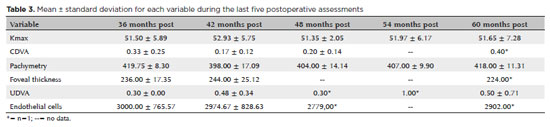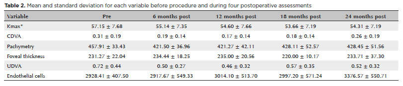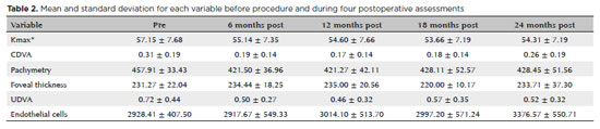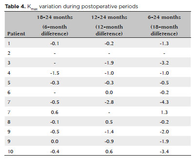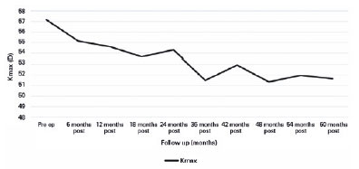 Comparing the Kmax results, a statistically significant difference was observed at all visits (p=0.002), except for Kmax difference between preoperative and 6-month postoperative periods and Kmax difference between 12 and 18 months after the procedure (Graph 1). A tendency toward the reduction in Kmax mean and its standard deviation was noted from the preoperative period to 5 years after surgery.