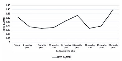 Corrected distance visual acuity (CDVA) exhibited a significant difference (p=0.006) when compared with the preoperative mean at all postoperative assessments (Graph 2). The CDVA mean improved from 0.30 to 0.17 (logMAR) during the first year after surgery. This represented a gain of approximately two lines of vision. A crucial point to highlight was that no vision loss was observed in any of the analyzed patients.