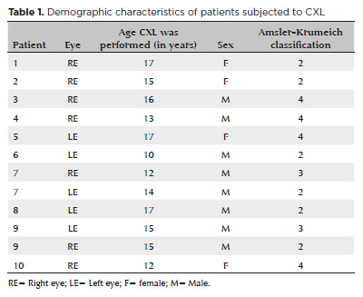 Some previous studies have assessed corneal CXL results in the pediatric population. Other studies have concluded that after the procedure there have been an increase in visual acuity with disease stabilization(2,10,11), which is concordant with the findings observed in the cases of this study.