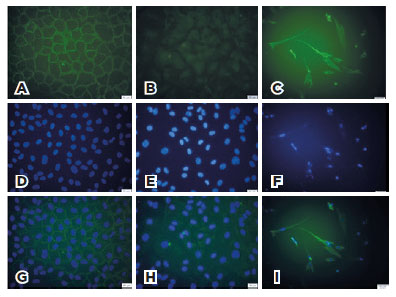 The cultivated BCC and fibroblastic cells were fixed with methanol for 10 min at -10°C and permeabilized with 0.25% Triton X-100 (Sigma-Aldrich, Munich, Germany) and blocked with 1% bovine serum albumin in phosphate buffered saline (PBS) for 90 min at room temperature. The BCC cells were initially incubated with anti-BER-EP4 antibody (1:50, mouse IgG anti-Human antibody; Dako, Carpinteria, CA) and anti-EMA antibody (1:100, mouse monoclonal, Dako, Carpinteria, CA) overnight at 4°C. They were subsequently incubated with fluorescein isothiocyanate (FITC)-conjugated goat anti-mouse IgG (1:100, Santa Cruz Biotechnology) and FITC-conjugated goat anti-mouse IgG (1:100; Santa Cruz Biotechnology) for 45 min in the dark and at room temperature, respectively. The cultivated fibroblasts were incubated with anti-vimentin antibody (1:200, rabbit polyclonal IgG; Santa Cruz Biotechnology Inc., Dallas, USA) overnight at 4°C and treated with the FITC-conjugated goat anti-rabbit IgG (1:100; Santa Cruz Biotechnology Inc., Dallas, USA). After nuclear DNA staining with 4,6-diamidino-2-phenylindole dihydrochloride (DAPI, 1.5 mg/mL; Santa Cruz Biotechnology) was performed, the slides were examined using a fluorescence microscope (Olympus IX71; Tokyo, Japan) at an excitation wavelength ranging from 450 nm to 520 nm. The corresponding images were then captured with a digital camera (Olympus U-TV0.63XC; Tokyo, Japan).