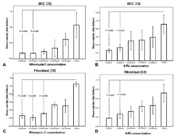 Both cultivated BCC and fibroblastic cells showed a significant reduction of viability and an increase in the concentrations of MMC and 5-FU (Figure 2). The optimal dosages of MMC and 5-FU based on the survival of less than 50% of the exposed BCC cells and more than 50% of the exposed fibroblastic cells, were 0.00312 and 0.312 mg/mL, respectively.