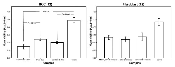 In the next step, the viability of the cultivated BCC and fibroblastic cells exposed to the optimal dosages of MMC, 5-FU, and their combination was investigated. The mean viability rates of the exposed fibroblastic cells were not significantly different, but mean viability rate of the BCC cells exposed to MMC alone and the combination of MMC and 5-FU significantly differed from that of the controls (p=0.002 and p=0.04, respectively; Figure 3). The mean viability of the treated BCC cells with 5-FU alone was not significantly different from that of the controls. The mean viability rate of the BCC cells exposed to the optimal dose of MMC was less than those exposed to the optimal dose of 5-FU (p=0.04).