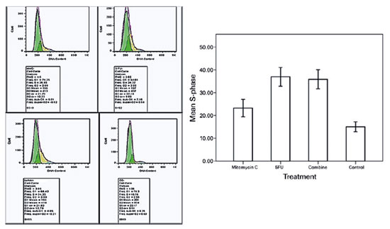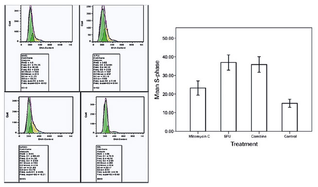 The rate of the S phase cell cycle arrest in the cultivated BCC cells treated with 5-FU (36.94% ± 3.57%), MMC (23.22% ± 3.33%), and their combination (35.85% ± 3.64%) was higher than that of the nontreated controls (15.03% ± 1.90%; Figure 4); however, this difference was not statistically significant (p>0.05).