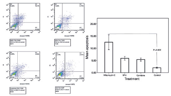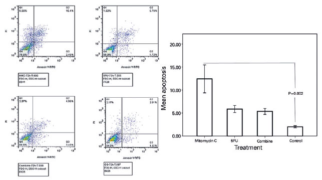 The highest rate of apoptosis was observed in the cultivated BCC cells treated with MMC (12.43% ± 2.63%), and this value was significantly different from that of untreated controls (2.00% ± 0.20%; p=0.002). The apoptotic rates in the BCC cells treated with 5-FU (5.87% ± 0.67%) and the combination of MMC and 5-FU (5.35% ± 0.57%) were less than that in the BCC cells treated with MMC. Conversely, they were more than the untreated controls (Figure 5), but these differences were not statistically significant (p>0.05 in the corresponding comparisons).