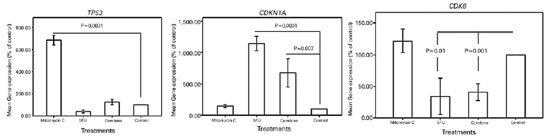 The expression of CDKN1A in the cultivated BCC cells treated with 5-FU and the combination of MMC and 5-FU was higher than that in the controls (p=0.0001 and p=0.007, respectively). The expression of TP53 in the cultivated BCC cells treated with MMC was also higher than that in the controls (p=0.0001). The expression of CDK6 in the BCC cells treated with 5-FU and the combination of MMC and 5-FU significantly reduced compared with that in the controls (p=0.01 and p=0.001, respectively; Figure 6).