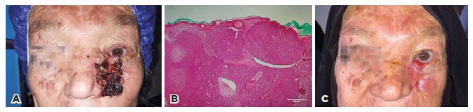 The complete resection of lesions was associated with extensive anatomical damage requiring advanced reparative plastic surgery. As such, a diagnostic incisional biopsy of the lesion concurrent with intralesional injection of MMC (0.00312 mg/mL) was performed after the informed consent was obtained from the patient, considering the patient’s poor socioeconomic conditions. Histopathological examinations revealed the presence of an ulcerative nodular BCC, and the intralesional injections were repeated for the next 2 months (one injection per month). Clinical examinations in the 1st week and by passing 4 months from the 3rd intralesional MMC injection (Figure 7), the lesion significantly improved without evidence of recurrence; however, a cicatricial left lower lid retraction occurred.