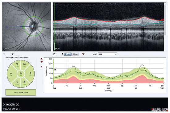 We evaluated the effect of COVID-19 infection on the peripapillary retinal nerve fiber layer (pRNFL) using spectral-domain optical coherence tomography (SD-OCT) (Figure 1). Our study had been approved by the institutional review board and was performed in accordance with the tenets of the Declaration of Helsinki.