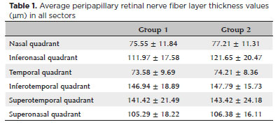 A total of 32 eyes from 32 patients with COVID-19 (Group 1) and 34 eyes from 34 healthy subjects (Group 2) were included. All patients in Group 1 were positive for COVID-19 following real-time reverse transcriptase-polymerase chain reaction from nasopharyngeal swabs. No significant difference in age and gender had been observed between both groups (p=0.6 and 0.4, respectively), while slit-lamp examination was normal for all cases. The average pRNFL thickness values are presented in t able 1. Accordingly, a significant difference in the inferonasal sector had been observed between both groups (p=0.04).