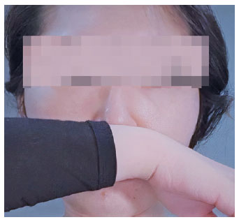 The philtral pressure technique (PPT), a simple technique previously described by the authors in the management of PSR, reliably prevents the urge to sneeze(4). It involves the application of a firm digital pressure transversely to the skin of the subphiltral region, directed posterosuperiorly onto the maxilla, inferior to and abutting the inferior nasal spine (Figure 1). This stimulates the local mechanoreceptors, overriding the trigeminal nerve irritation. Alternatively, it may interfere with the coactivation of neighboring parasympathetic fibers. Whatever the case, the PPT almost always prevents sneezing(4).