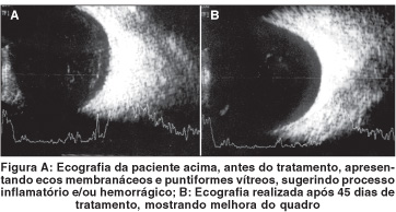 No dia 9/07/02, a paciente se apresenta com formação de hipópio, fibrina na câmara anterior e depositada sobre a margem da íris, e grande quantidade de células. O exame ecográfico revelou presença de ecos puntiformes e membranáceos vítreos, móveis e de média a baixa refletividade, sugerindo processo inflamatório e/ou hemorrágico. Desta forma, a paciente foi então submetida à punção do corpo vítreo para análise laboratorial. O esfregaço do exame direto indicou presença de leveduras e a cultura para fungos mostrou crescimento de Candida albicans. Realizou-se então, injeção intravítrea de anfotericina B (5 µg) e foi iniciado tratamento antifúngico tópico (clotrimazol 4/4 hs) e sistêmico (cetoconazol 400 mg/dia). Foi iniciada a retirada gradual dos corticóides tópico e sistêmico e da ciplosporina. A paciente apresentou excelente evolução, com diminuição da celularidade vítrea e de câmara anterior e com desaparecimento da fibrina. Intercalaram-se períodos de melhora e de piora do quadro, sendo então repetida mais duas vezes a injeção intravítrea de anfotericina B. Após 45 dias de tratamento, a paciente apresentava acuidade visual sem correção de 20/60 no olho direito e presença de catarata em estágio inicial. Apresentava apenas alguns precipitados ceráticos pigmentados inferiores, mas nenhum sinal de reação inflamatória intra-ocular. Foi iniciada a retirada das medicações tópicas e sistêmicas com sucesso, sem reativação do processo infeccioso. Com a evolução da opacificação cristaliniana, a visão passou a ser de movimentos de mão. Foi submetida, com êxito, à facoemulsificação com implante de lente intra-ocular no olho direito no dia 5/12/2002, apresentando, com 30 dias de pós-operatório, acuidade visual de 20/40 neste olho.