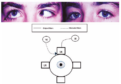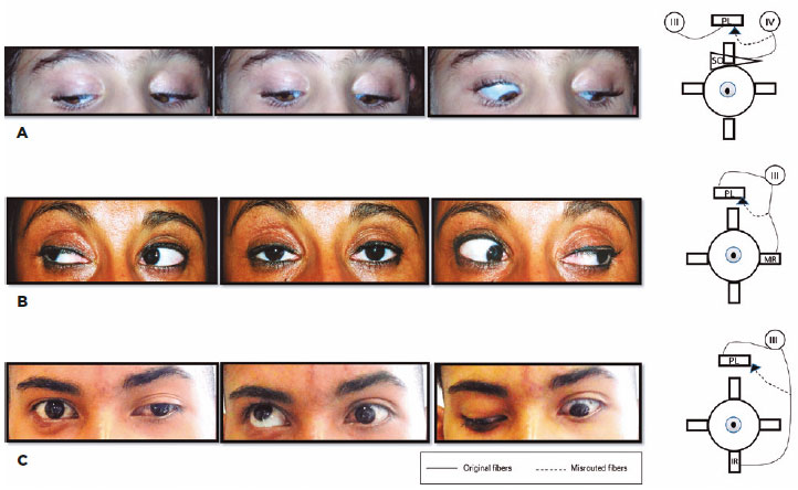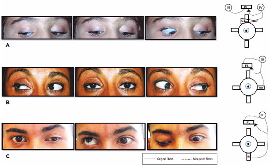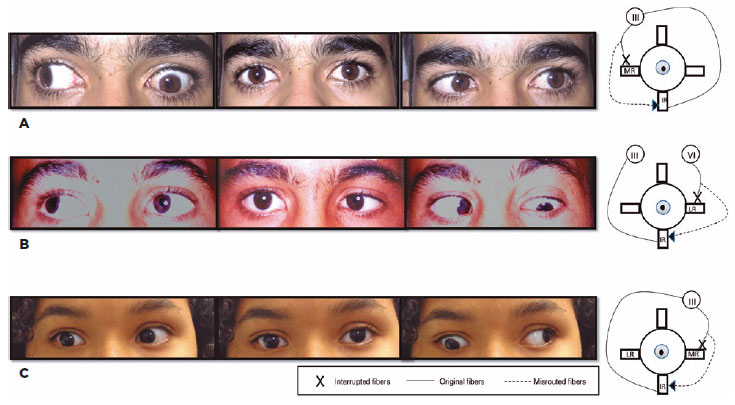 Figure 3 presents three cases with the inferior rectus receiving aberrant fibers. In Figure 3A, in the right gaze, the boy has a depression of the left eye instead of adduction, indicating that the inferior rectus received the fibers that should be directed toward the medial rectus. This dysinnervation resulted in a depression instead of adduction. In Figure 3B, the left eye of a boy depresses when attempted to abduct, leading to the speculation that the inferior rectus receives fibers from the sixth nerve. An esotropia of 40 PD in the primary position was observed. In Figure 3C, the girl previously operated for synergistic abduction (right lateral rectus recession 10 mm) has the same clinical picture as Figure 3A, but in the right eye (mutatis mutandis). She has a residual right exotropia of 10 PD, and the synergistic abduction movement vanished with the surgery, with only a persistent right eye depression upon attempted adduction (Figure 3).