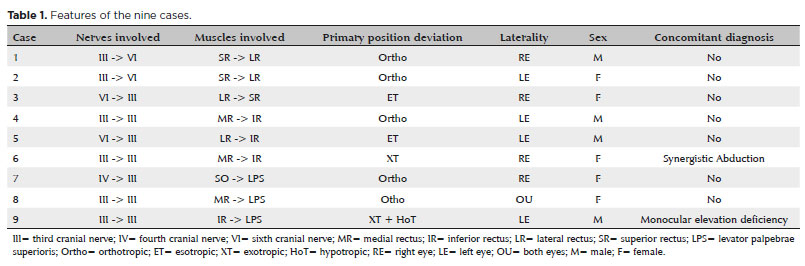 Results: Nine patients with congenital ocular synkinesis were included. A slight predominance of women was noted. In terms of laterality, four patients had only the right eye involved, four had only the left eye, and one had both eyes involved. Notably, 55.5% were orthotropic in the primary position. The third, fourth, and sixth cranial nerves were involved in the miswiring in 100%, 44.4%, and 11.1% of the cases, respectively.