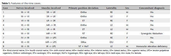 Resultados: Nove pacientes com sincinesias oculares congênitas foram incluídos. Houve discreta predominância no sexo feminino. Em termos de lateralidade, o olho direito foi o único envolvido em 4 casos, o olho esquerdo também em 4 casos e 1 caso apresentou acometimento bilateral. 55,5% dos pacientes eram ortotrópicos na posição primária. Os III, VI e IV nervos participaram da sincinesia em 100%, 44,4% e 11,1% dos casos, respectivamente.