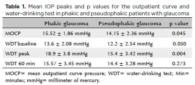 Results: A statistically significant difference was observed between the phakic and pseudophakic patients regarding the mean of the peaks in the intraocular pressure curves (p=0.045). A statistically significant intergroup difference was noted regarding the intraocular pressure peaks in the water-drinking test, with higher values observed in the phakic patients (p 0.004).