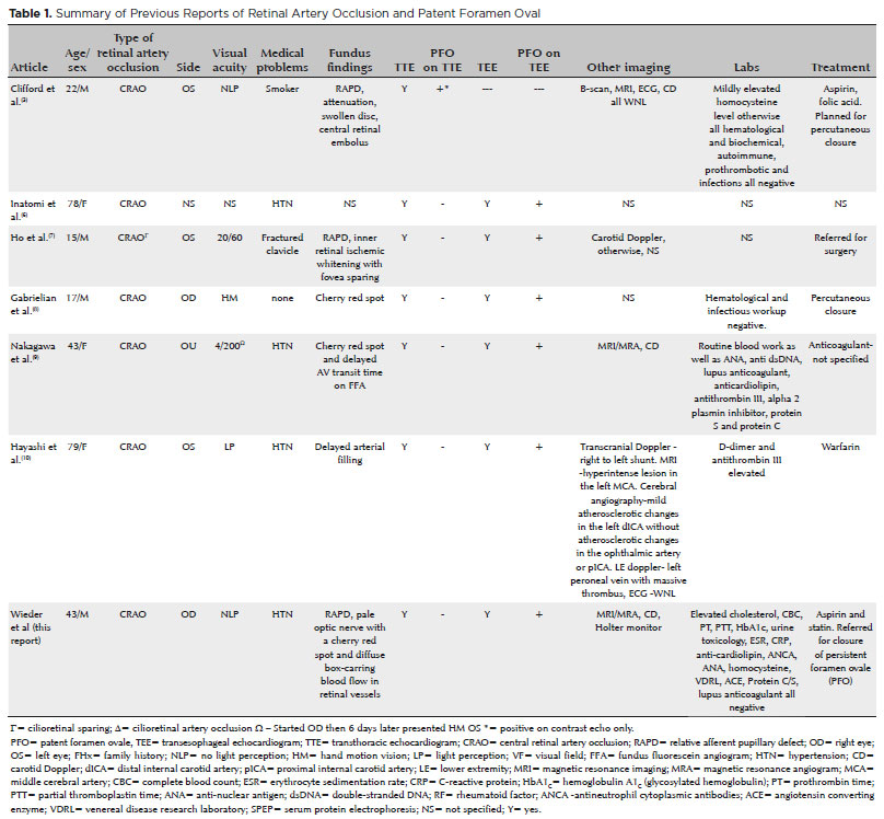O forame oval patente pode estar associado a derrames criptogênicos que incluem a oclusão da artéria retiniana. Descrevemos aqui um jovem previamente saudável que apresentou oclusão da artéria central da retina associada ao forame oval patente, sendo considerado portanto, a necessidade de um ecocardiograma transesofágico para seu diagnóstico. A avaliação cardiovascular e a neuroimagem não foram significativas. O estudo da bolha no ecocardiograma transtorácico revelou um shunt atrial direito-esquerdo e o ecocardiograma transesofágico subsequente revelou um forame oval patente. Esta anomalia cardíaca congênita foi o provável conduíte para uma oclusão tromboembólica da artéria central retiniana Na literatura, foram identificadossete pacientes com forame oval patente associado à oclusão da artéria central retiniana. O ecocardiograma transtorácico diagnosticou apenas um paciente (14,3%), enquanto o ecocardiograma transesofágico foi necessário para revelar o forame oval patente nos seis casos restantes (85,7%). Nosso caso e relatos anteriores suportam a ligação entre a oclusão da artéria central retiniana e o forame oval patente. Os profissionais devem considerar, como sendo mais sensível, o ecocardiograma transesofágico na avaliação inicial de pacientes jovens sem causas imediatamente identificáveis de oclusões da artéria retiniana.